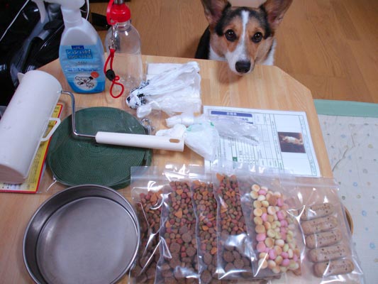 それを見つめ、自分の物のチェックをさせられる犬。