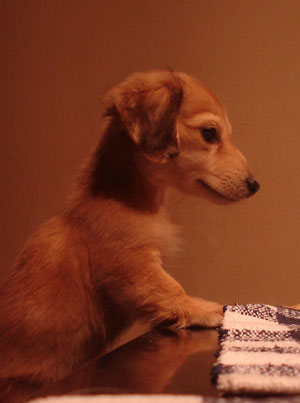 机の上のごはんがいつか貰えると芸をして待ち構える隆之介